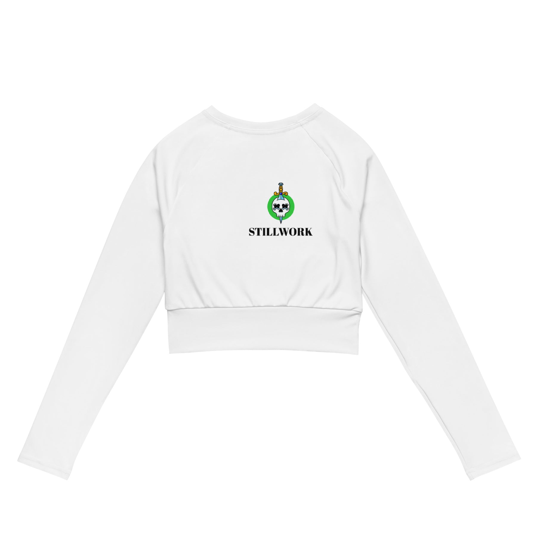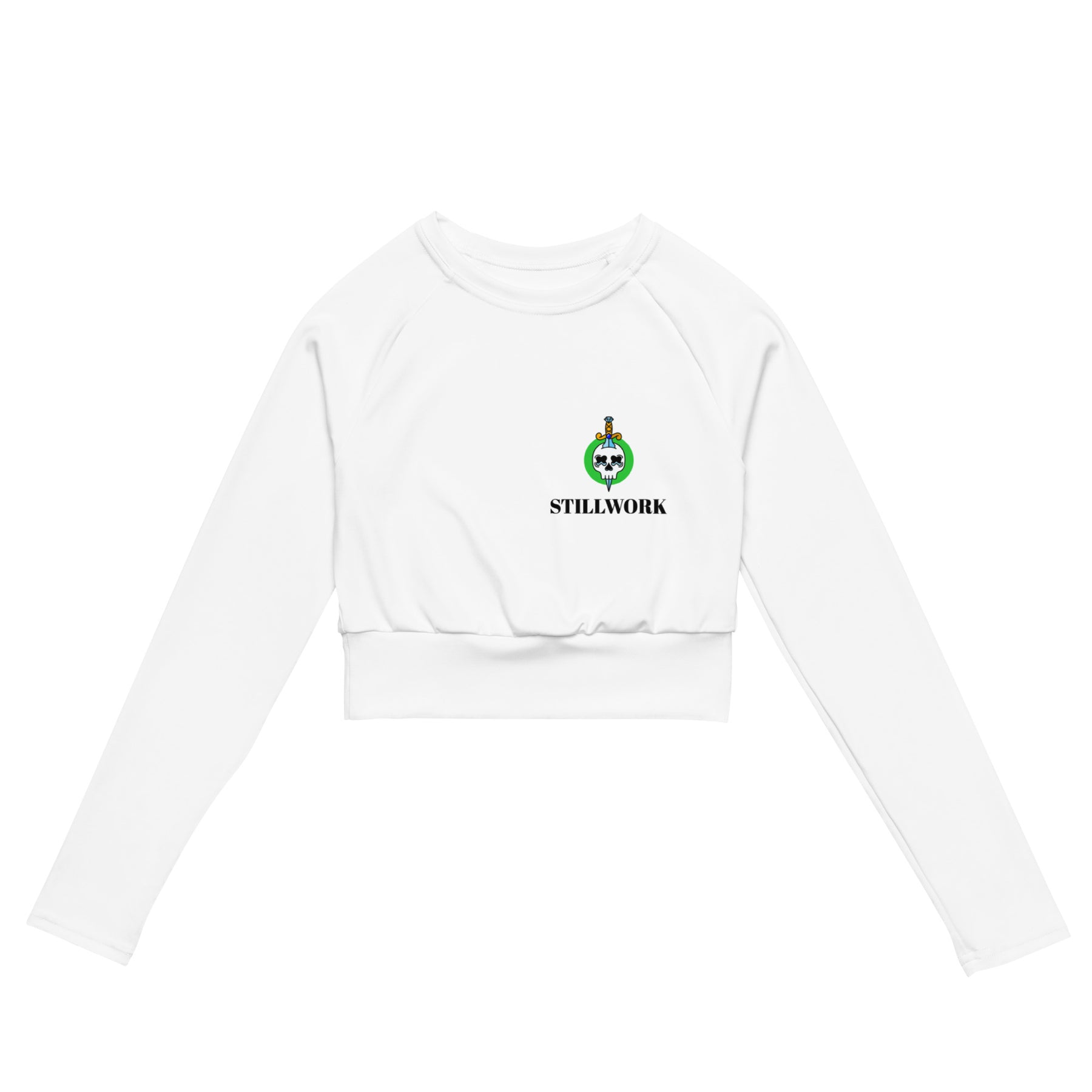 This long-sleeve crop top is made of recycled polyester and elastane, making it an eco-friendly choice for swimming, sports, or athleisure outfits. The crop top has a tear-away care label and a wide, double-layered waistline band for a comfortable fit.